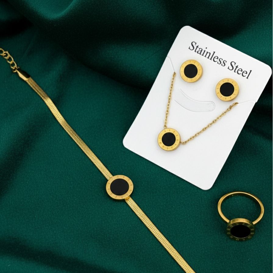 Elevate your accessory game with this stunning 4-piece jewelry collection. Crafted from high-quality, hypoallergenic stainless steel with a luxurious gold-tone finish, this set features a timeless Roman numeral design encircling sleek black onyx-style inserts.