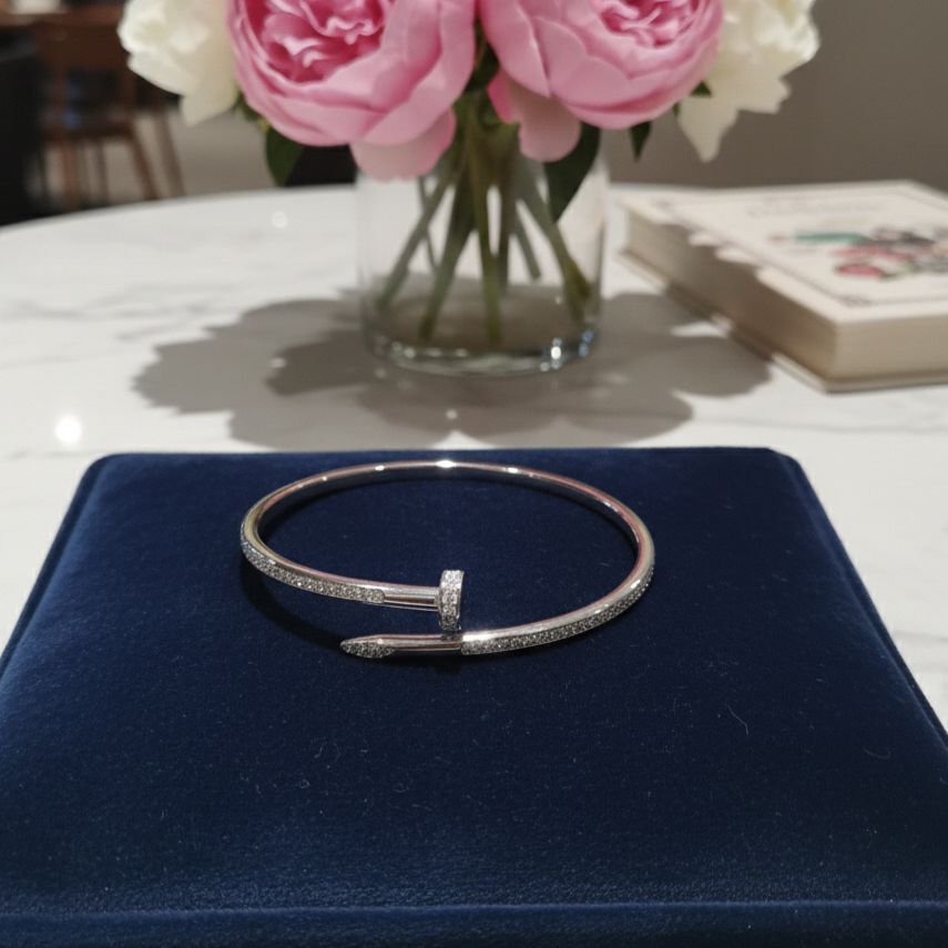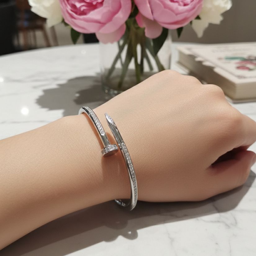 Elevate your everyday elegance with this stunning crystal-embellished nail bracelet. Inspired by iconic luxury design, this sophisticated bangle features a sleek silver-tone finish adorned with brilliant pavé crystals that catch the light with every movement.