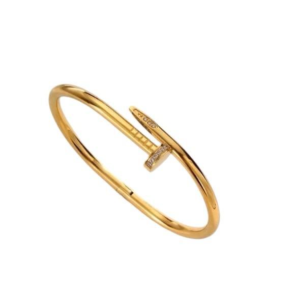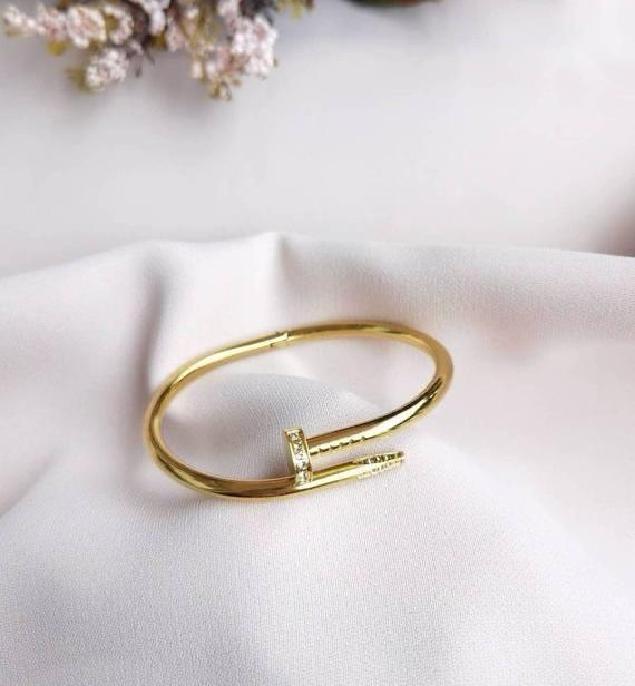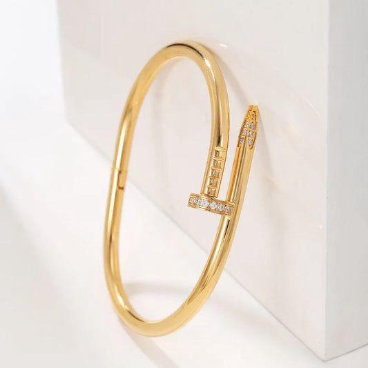 Make a bold statement with this luxury gold-tone nail bracelet. Featuring a sleek cuff design detailed with sparkling rhinestone pavé accents, this piece is a perfect blend of high fashion and edgy style. Ideal for stacking or wearing solo as a minimalist statement piece.